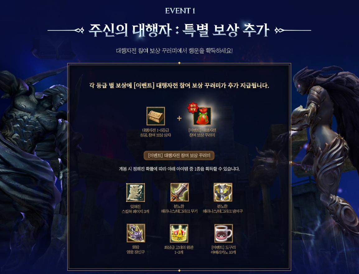 여름 방학을 맞아 다시 돌아온 거상 PC방 이벤트! PC방에서 거상도 즐기시고 푸짐한 아이템도 받아가세요! PC방 선물상자 수령 시 다음 날 오전 11시에 아이템 획득 기회가 4회 지급됩니다. 4 회식 하루 최대 2번, 8번의 랜덤획득 가능합니다. 누적 횟수에 따라 추가 보상을 받을 수 있습니다. 누적 20회는 고급 소탕령 3개 , 40회는 람채화의 인형 7일 , 70회는 단군의 거울 , 90회는 금상자 3개를 받을 수 있으며 누적 120회는 홍린세트 5가지 부위 중 한 가지를 선택하여 수령 가능합니다. 이벤트 기간동안 PC방에서 접속하신 모든 분들을 대상으로 행운을 드립니다! 이벤트 기간동안 누적 1시간 이상 플레이하신 모든 분은 자동 응모 됩니다. 누적 이용 사용시간이 많을수록 당첨 확률이 높습니다...